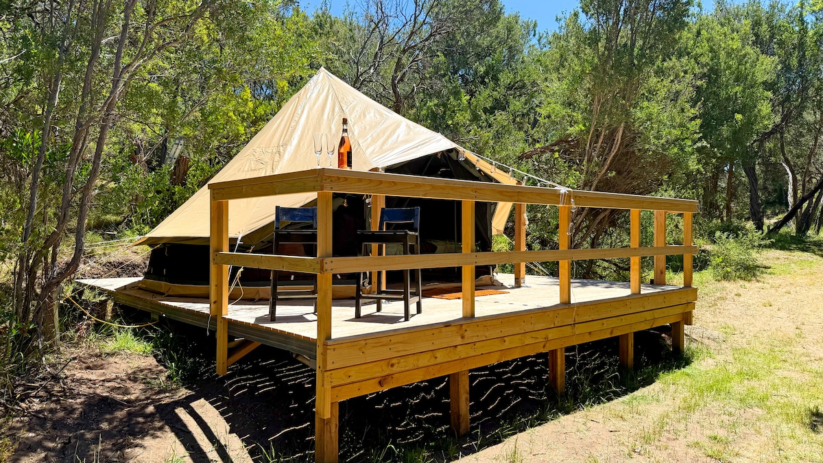 Enjoy the lovely setting of this romantic spot in nature. Wine and Gold country. 15 minutes to the renowned Pyrenees wineries. 6 meter Lotus Belle glamping tent. King bed. Amenities available on site for guests. 8 person spa for guests use. Full kitchen/laundry/TV/toilet and shower from farmhouse next to the Moongazer tent. Rainwater used on property. 30 meters from the Avoca river. No Neighbours. No traffic noise. Relax and recharge with the sound of native birds. 2 pushbikes for guests use.