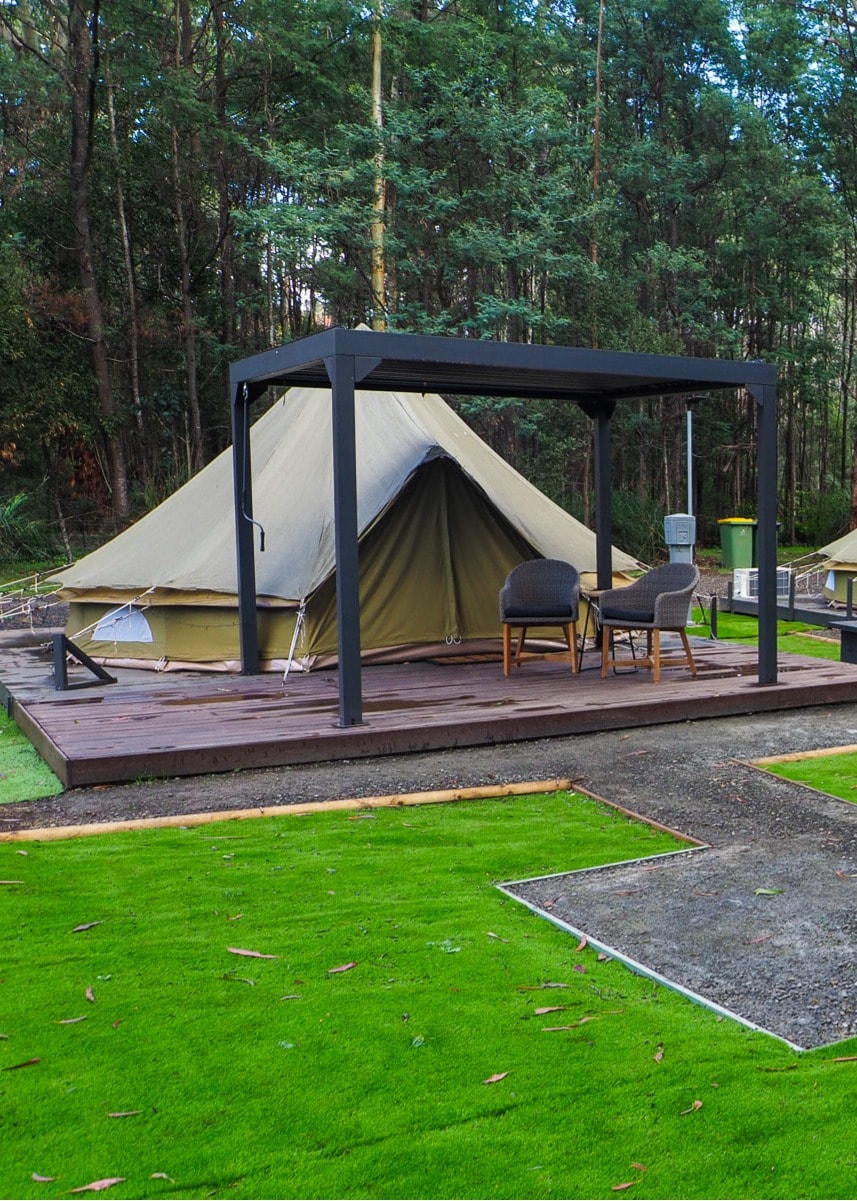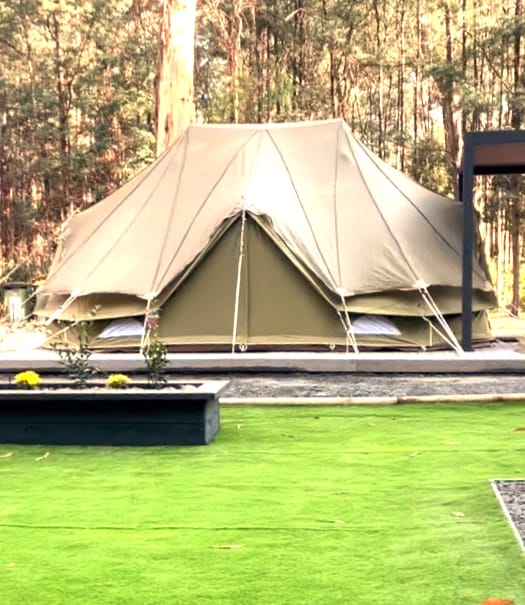 One of three amazing new Glamping Tents nestled by the Steavensons River in the little Victorian High Country town of Marysville. Need to unwind? Get out of the city? Like the sound of a running water?? The Kookaburra tent is the premium in our range. Measuring a huge 6 x 4 m it includes a Queen bed; split-system; coffee machine; fridge; flame heater, occasional chairs and mood lighting! You'll have an outdoor setting and your own fire pit to roast some marshmallows on!