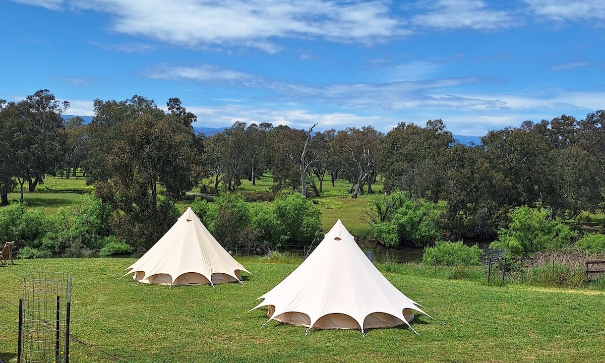 Enjoy the lovely setting of this romantic spot in nature. Wine and Gold country. 15 minutes to the renowned Pyrenees wineries. 6 meter Lotus Belle glamping tent. King bed. Amenities available on site for guests. 8 person spa for guests use. Full kitchen/laundry/TV/toilet and shower from farmhouse next to the Moongazer tent. Rainwater used on property. 30 meters from the Avoca river. No Neighbours. No traffic noise. Relax and recharge with the sound of native birds. 2 pushbikes for guests use.