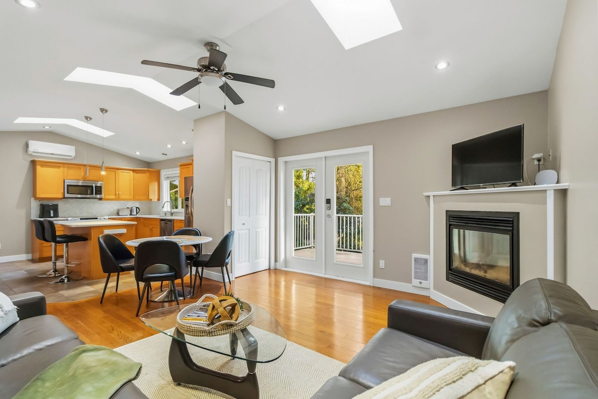 **Provincial reg. H550530166, Municipal License 00020298- Fully inspected** Feel right at home in our bright, modern, stylish guest house . We offer self check-in to your very own private space on the edge of the city, nestled under soaring 200 year old oaks in a quiet neighborhood- less than 15 min from the hustle of downtown Victoria and world famous Butchart Gardens! Our open concept cottage boasts vaulted ceilings, skylights, TV, laundry, free parking- everything for a relaxing retreat!