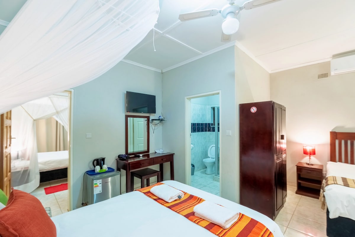 Neat room with two double sized beds. This room is suitable for 2 people.Bathroom is ensuite with a hot shower. The room has a private verandah with a view of the pool and lush gardens. The perfect place to relax and enjoy the sunny days in Vic Falls. Air conditioning and free wifi are also available.
