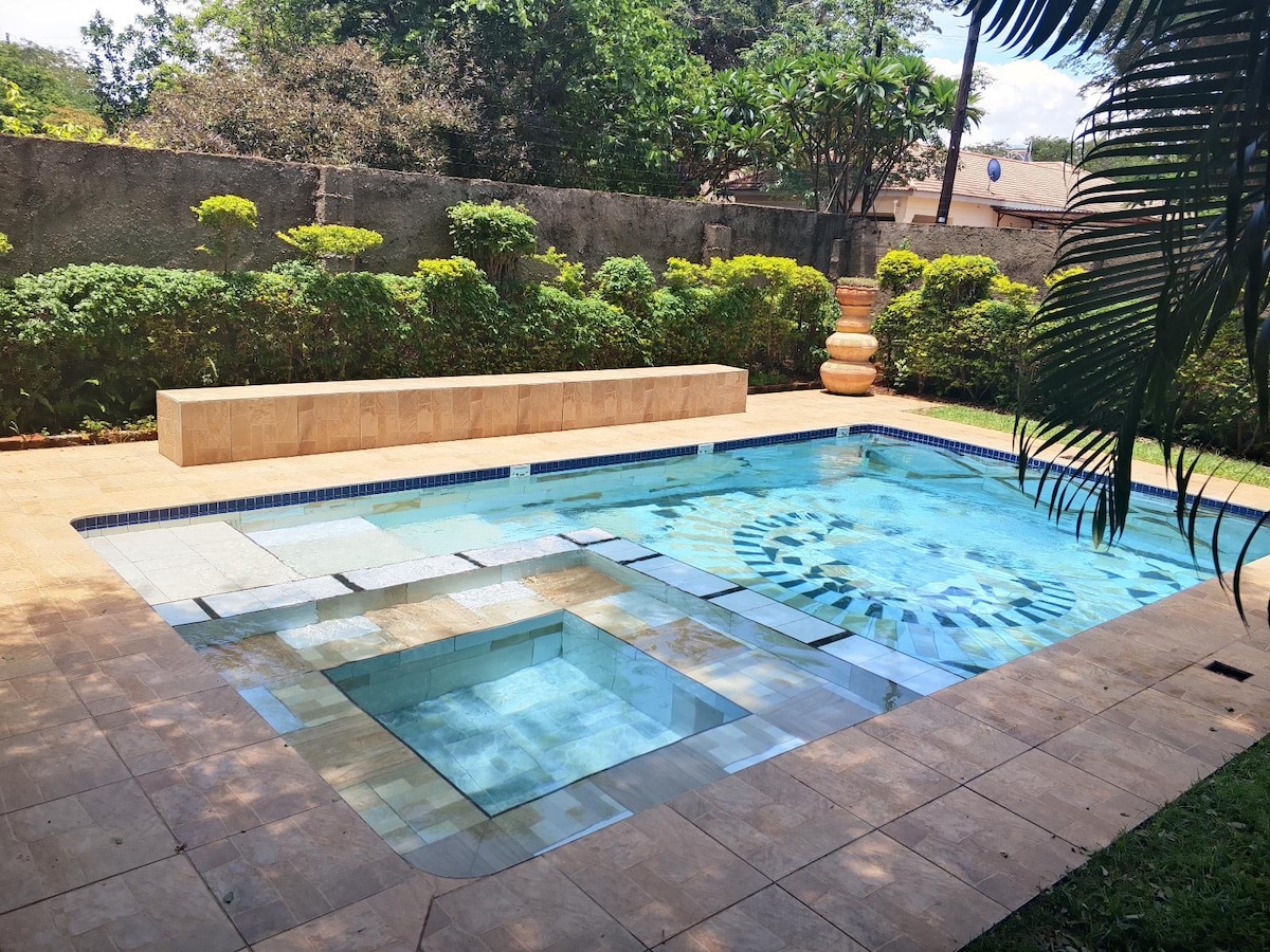The spacious, air conditioned, 1-bedroom cottage is set in a tranquil garden with a swimming pool. It has a light, bright living room and dining area, a large bedroom, a well appointed kitchen and an outside patio area. Leading off the bedroom is the ensuite bathroom (the only bathroom), with an over-the-bath shower. The sofas in the living area convert into comfortable single beds for guests 3 and 4. All beds have mosquito nets. The self-contained kitchen is well appointed.