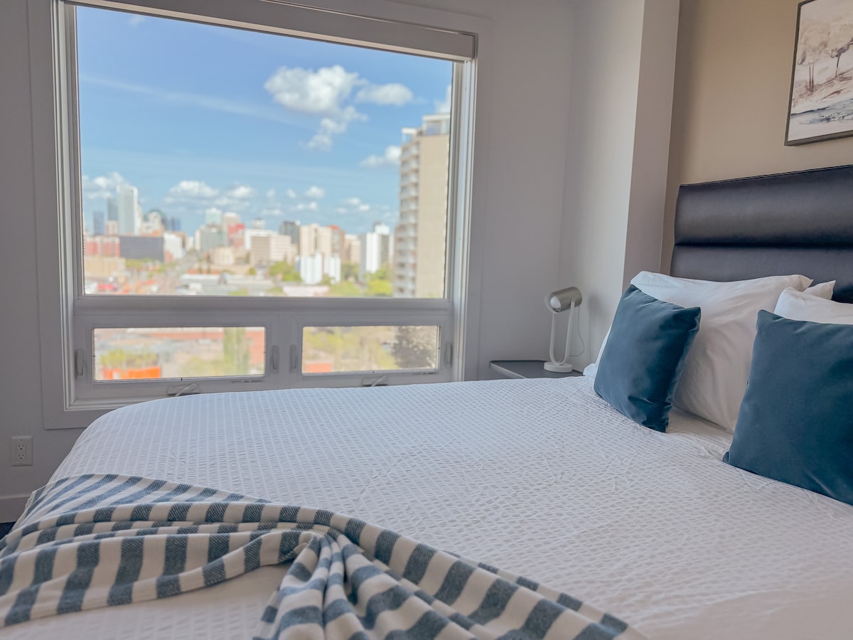 A fully equipped kitchen and cozy furnishings are perfect for longer stays. Use the pool and gym to maintain your excercise routine while you're travelling. Enjoy easy access to everything from this perfectly located home base. Take in stunning views of the city skyline from the balcony. You are just steps away from some of the city's best restaurants, cafes, and entertainment venues, walking distance to Rogers Place, MacEwan University and a quick transit to the University of Alberta.