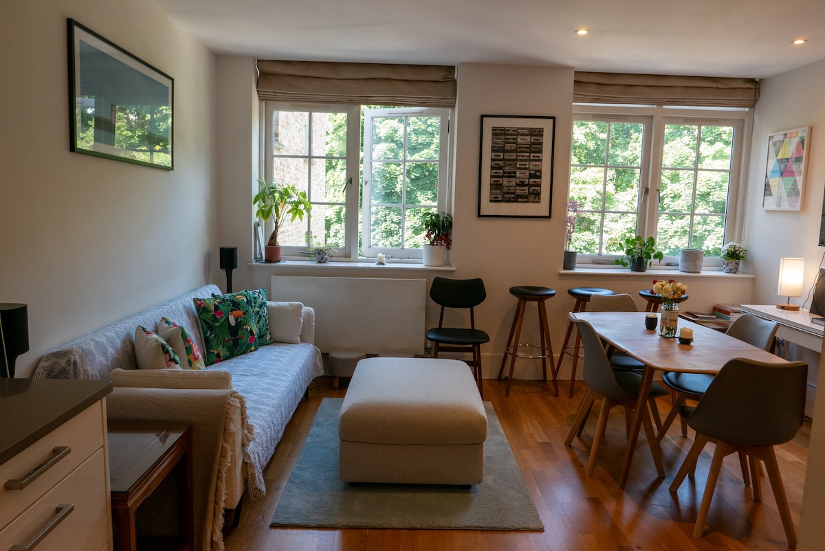This centrally located 2 bed stylish gem in Hackney is the perfect getaway for a London escape. Relax in the mid century modern styled living room looking out onto the gorgeous Round Chapel that hosts events like beer/wine festivals, sound baths, vintage sales & more The table converts to sit 4, main bedroom hosts a king size bed wt plenty of drawer & hanger space & second bedroom can be a single, double or bright office space with a desk We hope you enjoy this little haven of East End London