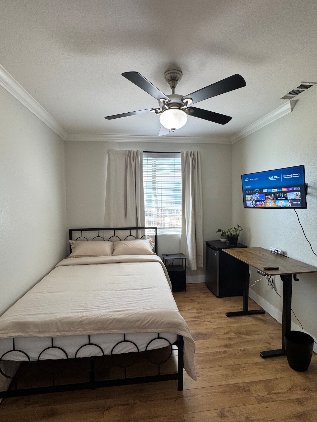 1BR/1BA Guest Suite ~ 350 sqft Private Entrance (Keyless Entry) Personal Thermostat Complimentary snacks, drinks, & toiletries Queen Tempur Pedic mattress w/ adj base 65 inch Smart HDTV in living room 55 inch Smart HDTV in bedroom Mini Fridge Electric Double Stove Top Keurig machine Board Games Desk