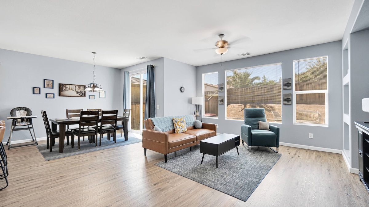 Relax with the whole family! Spacious 3 bedroom+guest room/ two 1/2 bath Home. Located in a safe and friendly centrally located community. The entire home is the true definition of comfort living with accents and furnishings. The fully equipped home offers comfortable living w/Wi-Fi, smart TV, coffee maker, washer + dryer, pool, bbq, fire pit and more! Close to restaurants, Victor Valley Mall, Scandia, Movies, 15 FWY, 395 HWY, Ontario Mills & Airport.