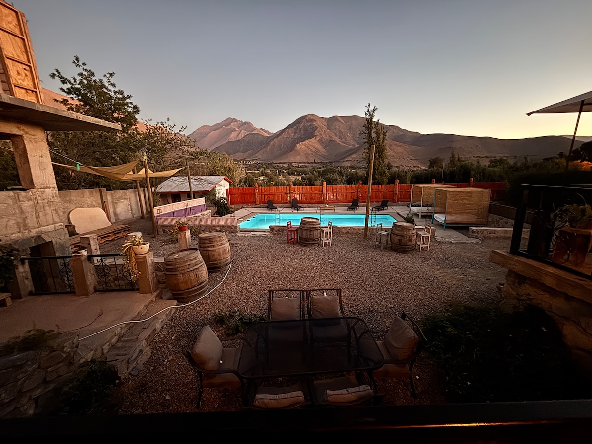 Hermosa casona en San Isidro, Valle de Elqui, ideal para vivir una experiencia de descanso en un entorno natural y tranquilo. Amplios espacios interiores y exteriores, piscina, quincho y terrazas para disfrutar en familia o con amigos. Capacidad para 10 huéspedes, habitaciones amplias con baño privado y casa completamente equipada. Ubicada a minutos de Vicuña y del Observatorio Mamalluca, perfecta para relajarse, contemplar los cielos estrellados y disfrutar la energía única del Valle de Elqui.