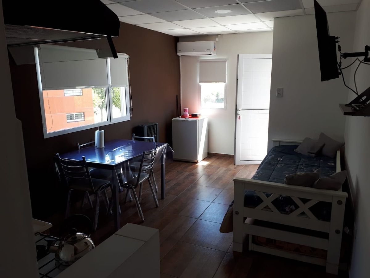 Disfrutá de la sencillez de este alojamiento tranquilo cómodo y céntrico. A dos cuadras de plaza San Martín y de la zona comercial. Apto para 3 personas la habitación cuenta con TV con Netflix, Amazon y Disney. Dos camas, una es marinera y salida a pequeño patio con mesa y sillas. Baño completo con ducha y cocina equipada con todo lo necesario. Calefacción por aire acondicionado frío calor y calefactor a gas. Te esperamos con café, yerba, te y todo lo básico para que estes cómodo al llegar.