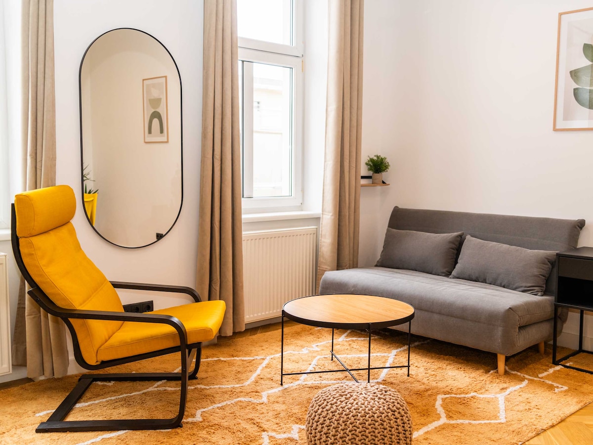 English: City life but make it comfy? Welcome to the Nest, where Vienna feels like a village while vibrant city life is only 10 minutes away! The spacious flat offers every amenity your heart desires- fast internet, a large comfy bed, AC, a cozy couch for long movie nights and a well equipped kitchen for cooking experiments - you basically don't need to leave the house in all pandemic fashion style.