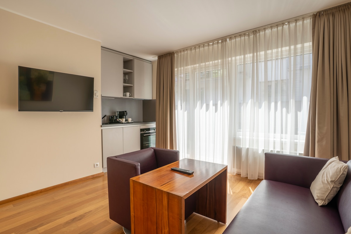 Our apartment, located on the first floor, features a balcony, offers approximately 43 m² of space, and is styled with a subtle purple accent. It is perfectly suited for business travelers or those looking to explore Vienna. Despite its very central location, you will find yourself in a green and quiet environment where you can relax, but also quickly get to the heart of the action. Thanks to the full range of amenities, all of our guests will find everything they need to feel right at home.
