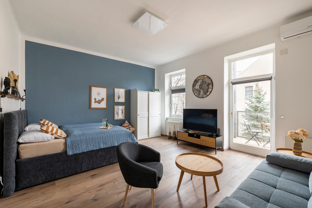 URBAN UNIT has 50m2, fits up to 4 guests & is located in the 16th district of Vienna. A one minute walk brings you to the tram station, which connects you directly to the historical city center by only 8 stops (no changing trains). The apartment is right next to a park so there's hardly any traffic. The whole building is brand-new (construction work finalized in January 2022). It has a private 19m2 terrace with comfy lounge furniture, accessible from the bed- & living room.