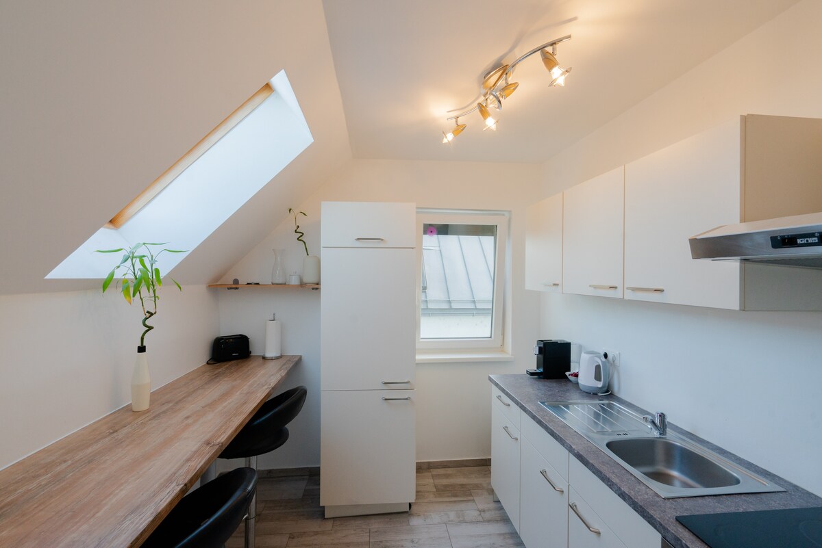 The around 30m² large studios are located in the fully converted attic of the Art Nouveau house. From here you can enjoy the most diverse views: Some look directly at St. Stephen‘s Cathedral, others at the unique geometric metal rivet decor of the former commercial court in Riemergasse. All studios have an anteroom with a fully equipped, modern kitchenette, a comfortable living/bedroom with 2 beds and a bathroom with toilet.