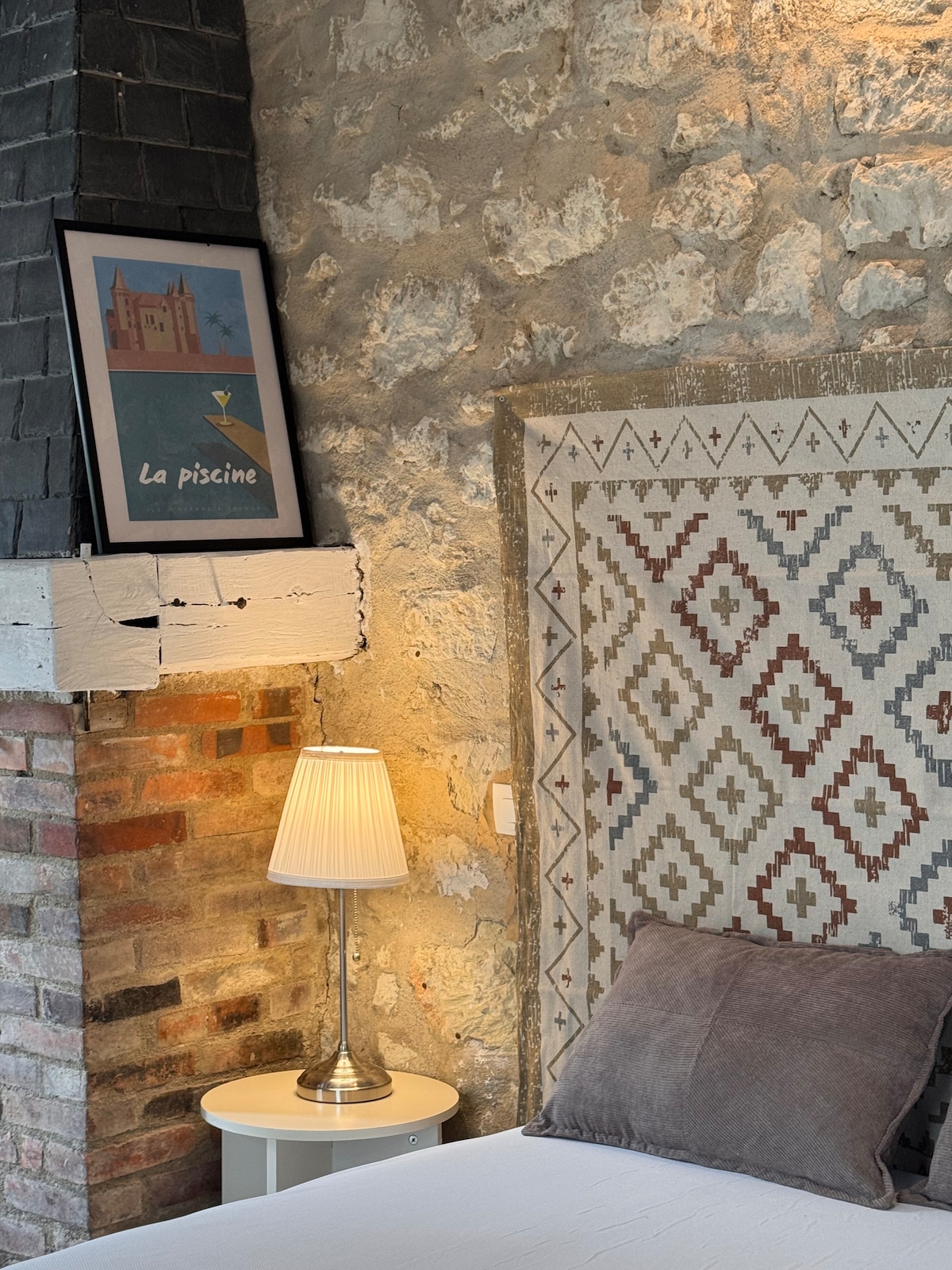 Studio room No. 6 located on the second floor in the attic by the Creuse river. It is decorated in a contemporary style and furnished with designer furniture. The floor is oak parquet, with thick carpet in the bedroom. It includes a kitchenette (fully equipped with a dishwasher, oven, fridge, dishes, etc. ), a NESPRESSO machine, a storage wardrobe, a desk, a dining table, and 2 armchairs, a double bed (160 cm), and two smart TVs (28 and 32 inches) that also allow you to listen to the radio.