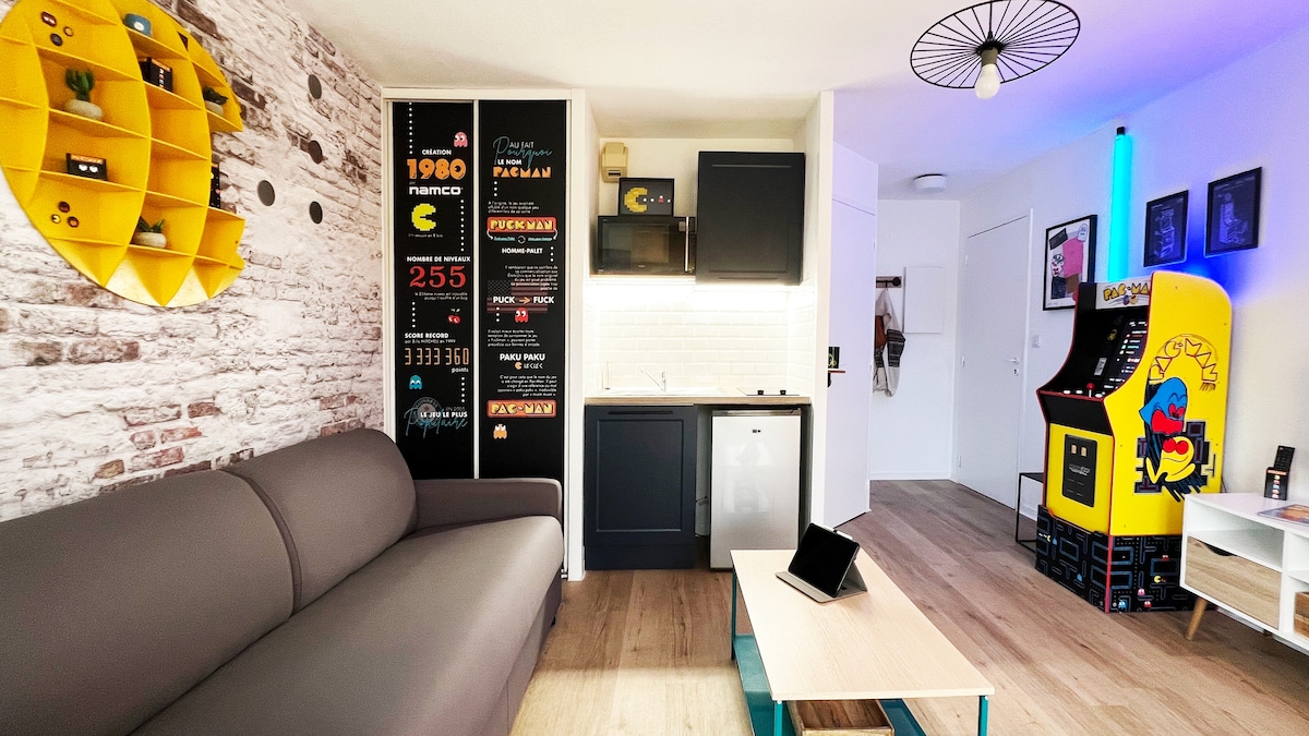 Bienvenue à Futurostudio Futuroscope ! Touriste ou un professionnel à la recherche d’une location à l’univers improbable, laissez-vous séduire par notre studio UNIQUE au Futuroscope ! Bien plus qu’un studio ou qu’une chambre d’hôtel, prolongez votre séjour grâce à notre studio à l’univers PACMAN ! Situé en plein cœur de la technopole, à 8 min à pied du Futuroscope ce studio de 1 à 4 personnes vous offrira tout le confort pour un séjour original ! Draps et serviettes de bain fournis.