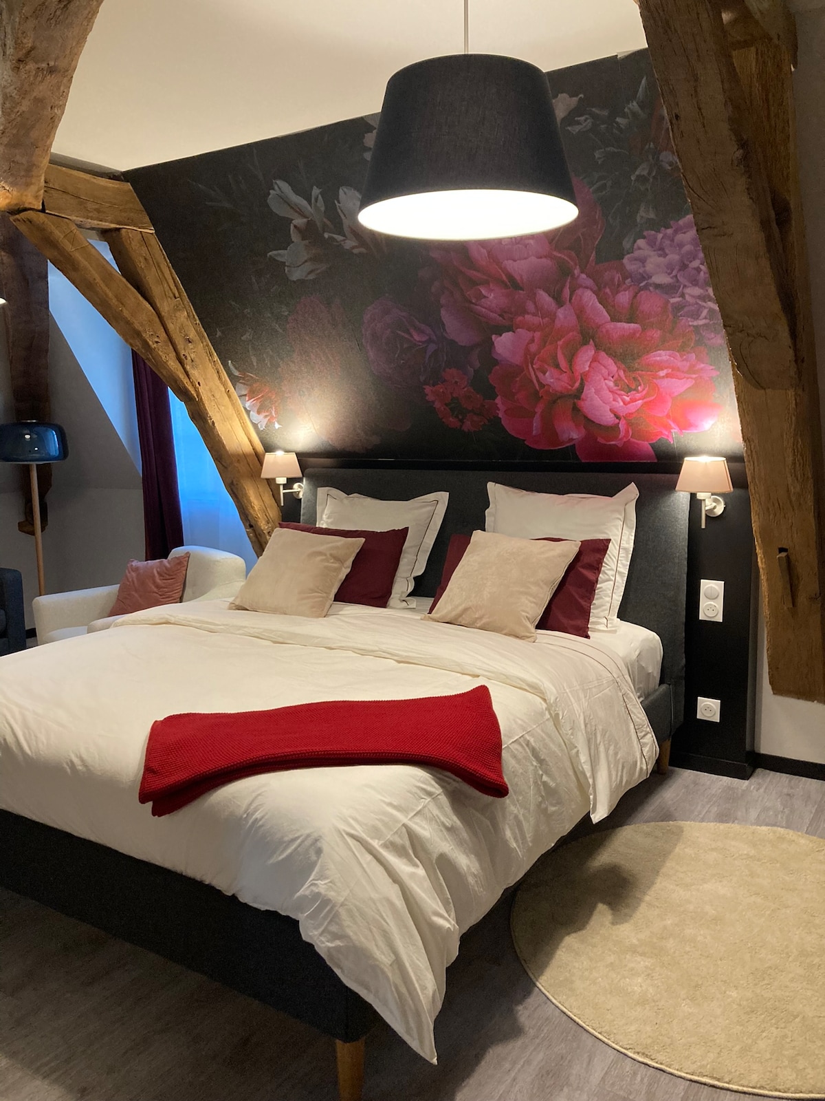 L'hôtel est situé au centre de la ville construite par le Cardinal de Richelieu en 1632. 20 km de Chinon et sa forteresse, 40 km de Villandry, Azay-le-Rideau, Fontevreau, parc du Futuroscope... Une de ces trois Chambres (voir photos) de 30m2, lit 180x200, salle de bain avec douche, wifi, machine à café Nespresso.