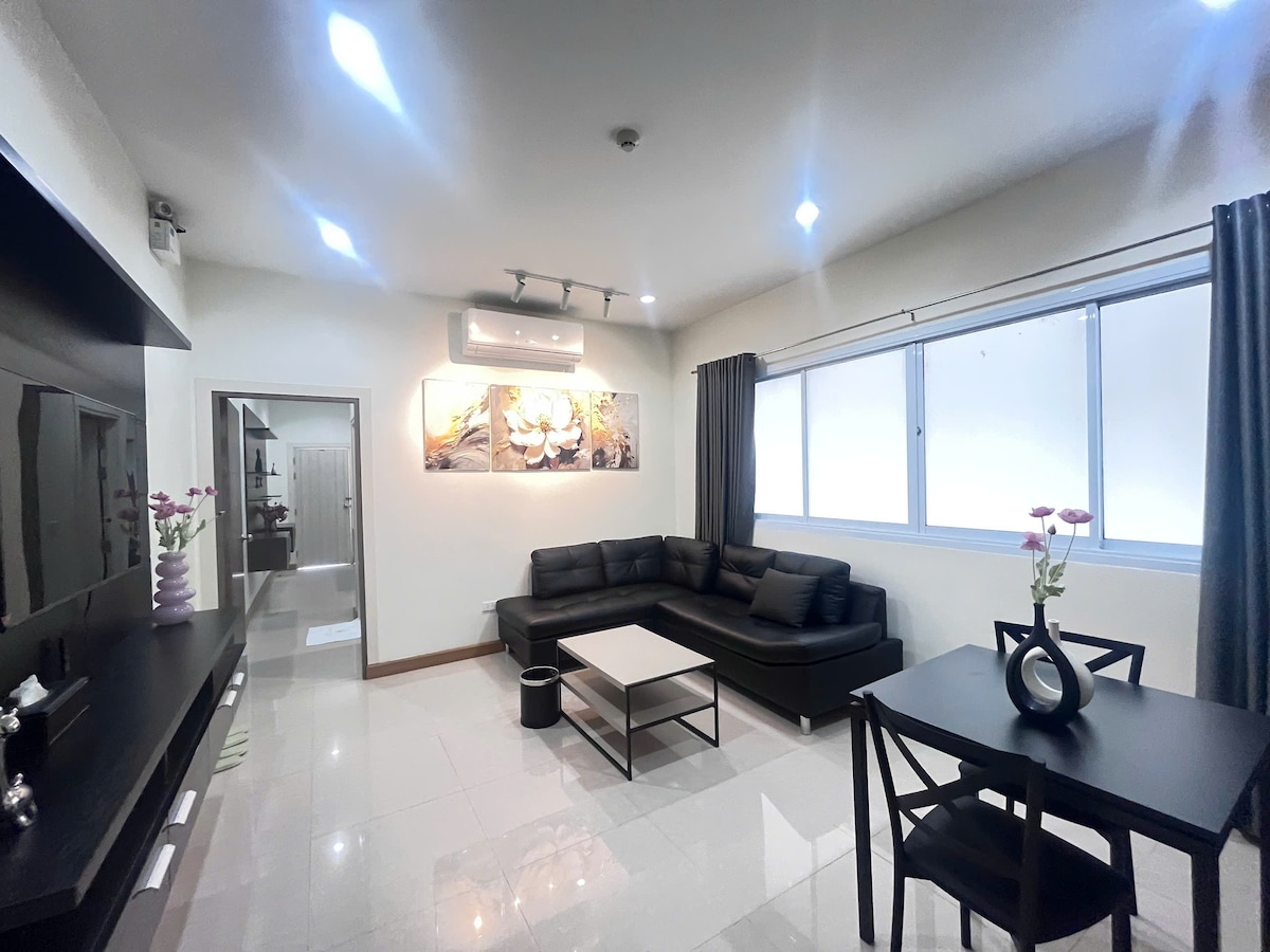 A modern one-bedroom apartment, 40m², located right in the heart of Vientiane. The room is airy, featuring a private balcony, a king bed (1.8m), air conditioning, TV, Wi-Fi, and a quiet workspace. You can comfortably cook with the kitchen, which comes fully equipped with basic cooking utensils and a refrigerator. Each apartment includes daily housekeeping service and the private bathroom. This is an ideal choice for business travelers, tourists, or long-term stays.