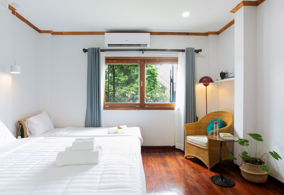 Tucked away on a quiet street, BlueHome offers a peaceful retreat perfect for families or group of friends. Our spacious, thoughtfully designed rooms let everyone relax — whether you’re unwinding after exploring the city or sharing moments together. Whether you’re heading from Pakse, Thakhek to Vang Vieng, Luang Prabang or Thai Embassy, make BlueHome your easy, comfortable stop to relax, reset & feel home. Central: restaurant, cafes, temples, Night Markets, Mekong are a 2 min walk away.