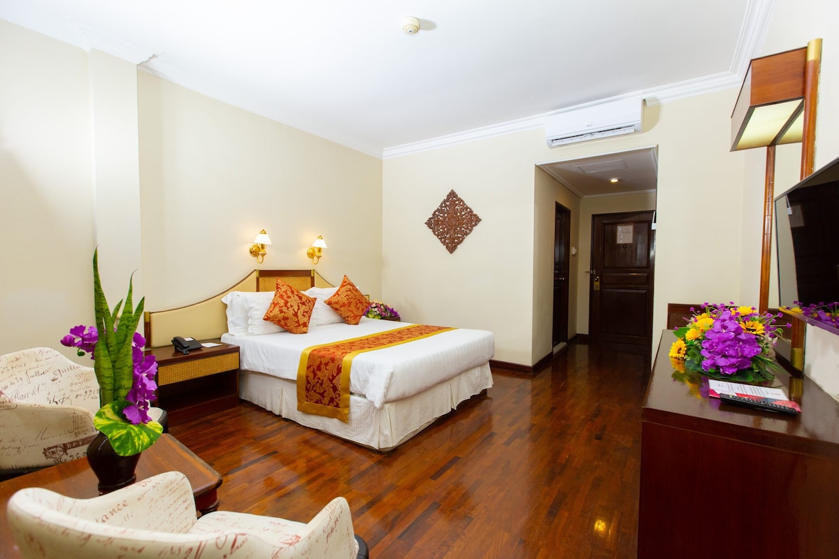 A modern one-bedroom apartment, 40m², located right in the heart of Vientiane. The room is airy, featuring a private balcony, a king bed (1.8m), air conditioning, TV, Wi-Fi, and a quiet workspace. You can comfortably cook with the kitchen, which comes fully equipped with basic cooking utensils and a refrigerator. Each apartment includes daily housekeeping service and the private bathroom. This is an ideal choice for business travelers, tourists, or long-term stays.