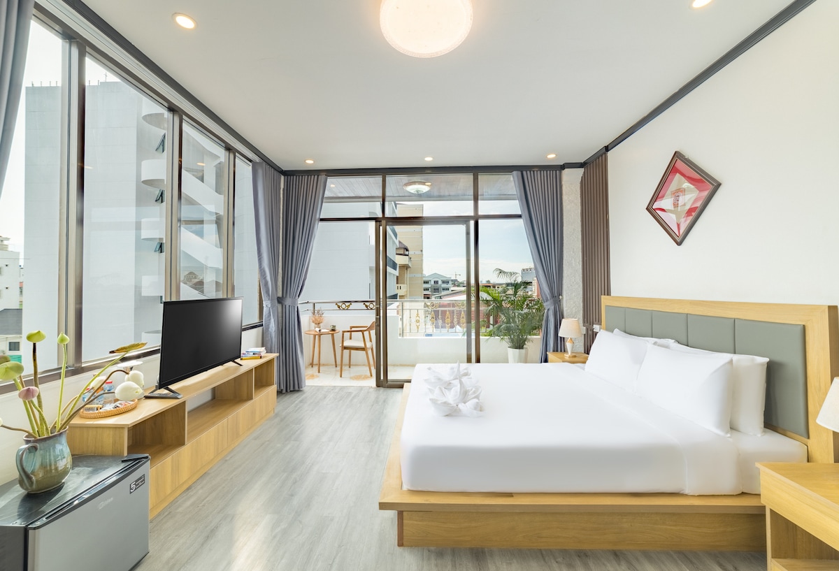 Enjoy a spacious 30m² room with a large private balcony and panoramic city views of Vientiane. The room is fully equipped with air conditioning, hot shower, TV, fridge, and wardrobe—everything you need for a comfortable stay. Bright, clean, and quiet, it’s perfect for relaxing after a day in the city. Free parking is also available on-site.