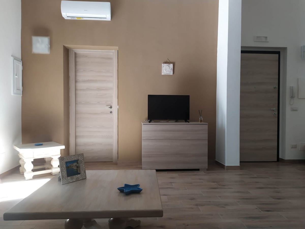 Monolocale con vista mare, climatizzato con zanzariere. Arredi nuovi. Angolo cottura con forno e munito di stoviglie. Letto matrimoniale, più letto a castello, TV, bagno con doccia calda. Presente un balcone,con tavolino e due sedie adibibile a zona pranzo/cena. biancheria da letto e bagno completa tranne accappatoio. La casa è vicina al centro storico (300 m). E' possibile raggiungere il mare a piedi in una dozzina di minuti (750 m) o con rispettive navette.