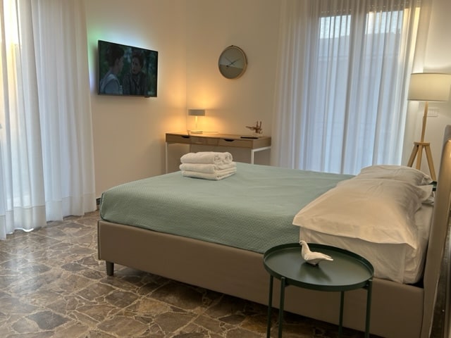 The house is located on the top floor and has a private veranda surrounded by giant palm trees where it is possible to have breakfast or lunch in contact with nature. The kitchen and living room are located in an open space with a typical Apulian Style. There is a bedroom with a double bed and a bedroom with 2 single beds. For families with more than 2 children, it is possible to use the sofa bed in the living room. The house is 5 min close to the beach and centru