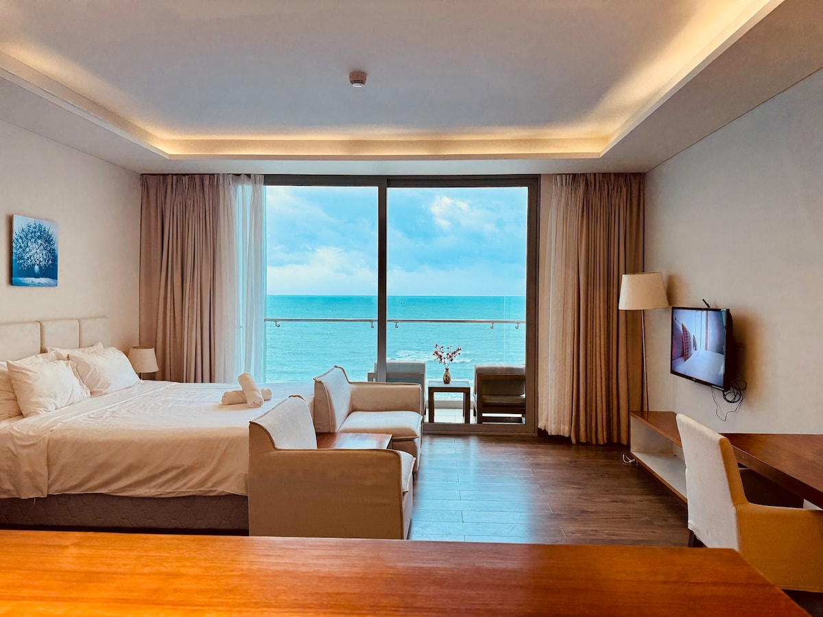 - Điểm nhấn chính là phòng hướng biển nơi bạn có thể nhâm nhi ly cà phê buổi sáng, ngắm bình minh rực rỡ hay thư giãn cùng hoàng hôn lãng mạn trên biển. - Căn hộ gồm 1 phòng ngủ, phòng khách liên thông bếp và thích hợp cho cặp đôi hoặc gia đình nhỏ. Nội thất tiện nghi: điều hòa, wifi tốc độ cao, smart TV, bếp nấu,… mang đến cảm giác thoải mái như ở nhà nhưng vẫn trọn vẹn trải nghiệm nghỉ dưỡng. - Vị trí ngay cạnh bãi biển – chỉ vài phút đi bộ, bạn đã có thể hòa mình vào làn nước trong xanh.