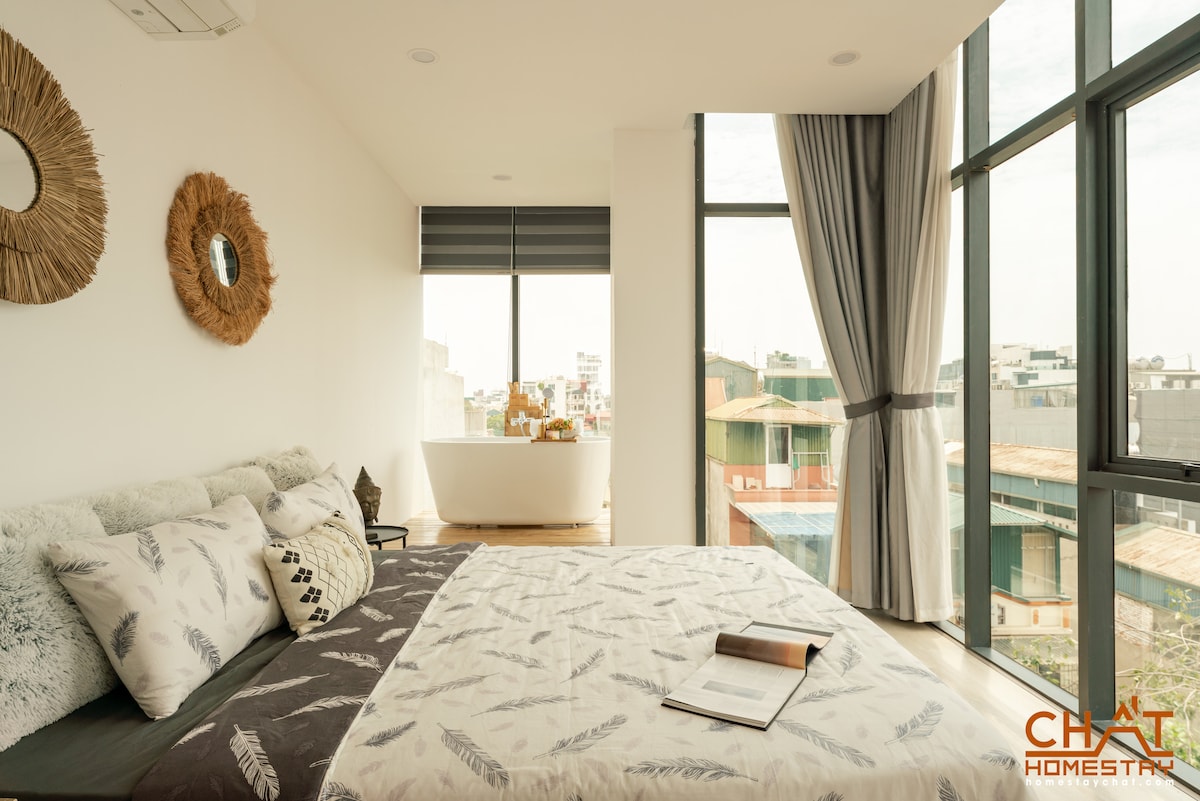 This is a 170m2 duplex penthouse in our newly opened boutique hotel in Hoan Kiem district. The design is stylish with the touches of local art, natural lighting reaching every corner of the apartment. The streets of Nam Ngu were lined with colonial villas and traditional Vietnamese houses. Originally, it was a small settlement where artisans and traders set up their homes and workshops.Neighborhood is lively in the morning with lots of good restaurants and well known local street food around.