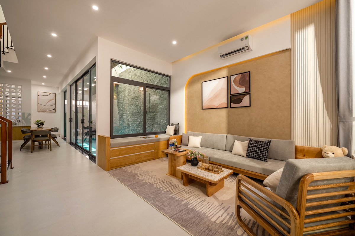 🎁 A newly built villa just 3 minutes’ walk to both Cua Dai Beach and Thu Bon River, offering a rare blend of privacy, wellness, and coastal charm. Enjoy a private pool, beach yoga, and walkable access to local restaurants and spas. With 3 serene bedrooms (2 king beds + 2 singles), it comfortably hosts 6 adults + 2 kids (under 6) — perfect for families seeking space, relaxation, and meaningful connection in a refined, tranquil setting.