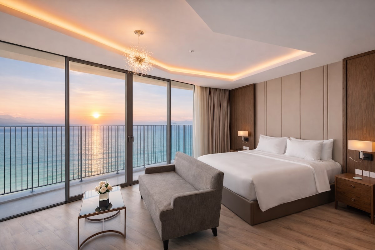 • Perfect choice to fully enjoy Nha Trang’s ocean view • Located in the absolute city center, steps from the beach • Unique fan-shaped apartment with a rare, wide curved balcony • Panoramic sea view overlooking the iconic coastal road arc • One of the widest and most open ocean views in Nha Trang • Hotel-style king bed, cozy sofa, and relaxing bathtub • Walk to laundry services, great restaurants, cafés, and night market • 24/7 check-in with professional front desk support