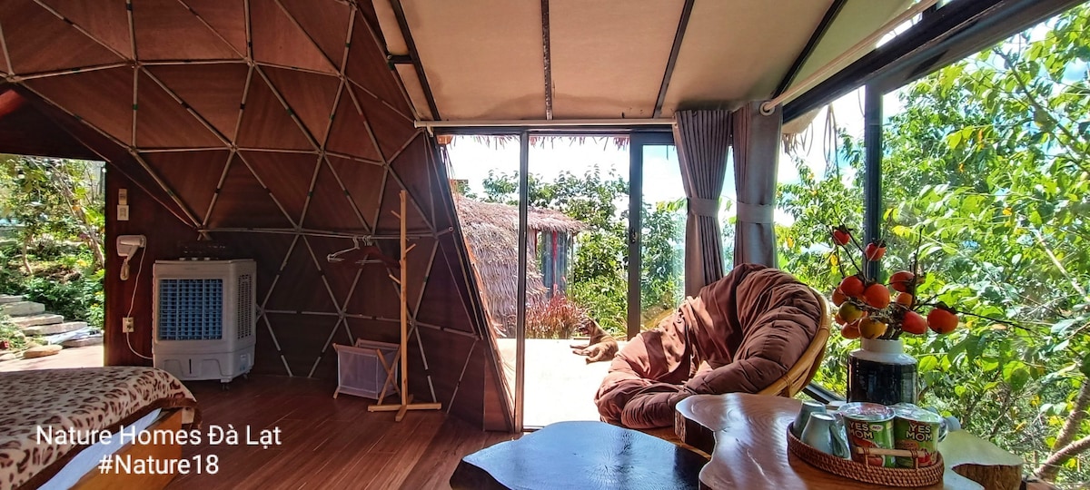 Phòng 1 giường với view kính mở rộng ôm trọn thung lũng và những dãy núi phía xa xa. Nếu có duyên thì vào buổi sáng chúng ta sẻ thấy biển mây phủ kín thung lũng. Nature Homes nằm bên sườn đồi và được ôm ấp bởi những tán cây xanh mát. Không gian chung rộng rãi với hồ cá koi, quán cafe, và khu vườn mênh mông. Bãi xe dành cho xe ô tô miễn phí. Sẽ rất thích chia sẻ ảnh chụp địa điểm độc đáo này với bạn bè.