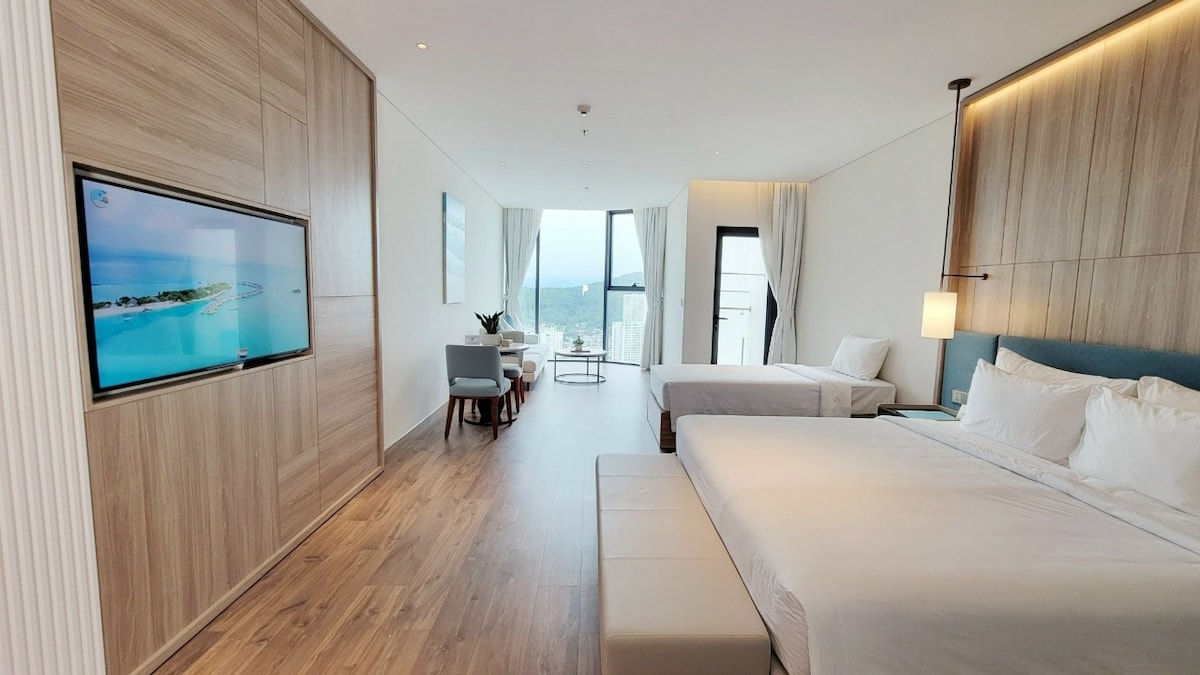 We believe that this view of the apartment is the peaceful and calm. Space of room is up to 150 sq meters including 3 bedrooms ensuite with 2 bathrooms, opened furnished kitchen and living room. Located in one of the best Resort in Da Nang and the pool and Kid camp are heaven of kids.