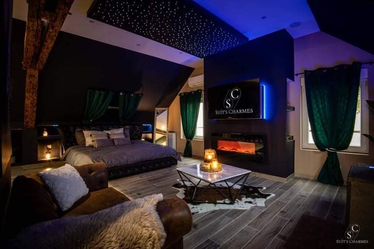 La Suit’s Charmes vous accueille dans une ambiance chaleureuse, Cocooning et apaisante. Rêver, Se reposer, Se regarder, Se sentir, S’enlacer, Se retrouver, Se confiner…S’aimer…Venez profiter de la Suit’s Charmes!! Suite de 75m2 , Face Gare de Belfort Jacuzzi Sauna Lit King Size TV 4K smart Tv, Netflix, TV Orange Wifi Cheminée Ciel Étoilé Douche XXL multi-jet (ciel douche indisponible à ce jour) Tout linge fourni Option possible: balançoire érotique/ Champagne/ appareil électroménager party