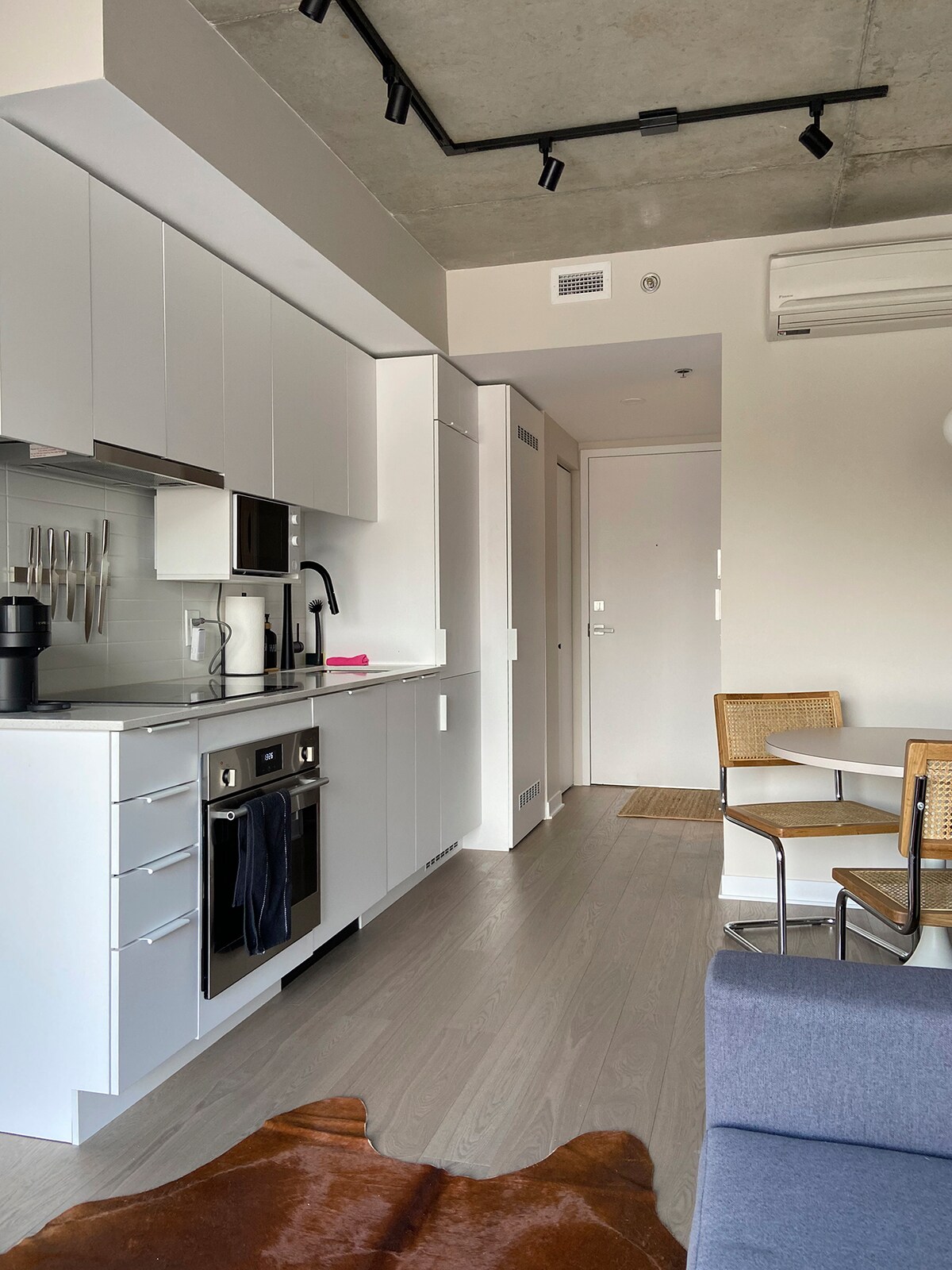 This is a modern 1 bedroomunit , fully equipped and decorated by a professional designer is located in the heart of Montreal's downtown neighbourhood (Place-des-arts area) Few steps away from Saint-Catherine, Saint-Denis and Saint-Laurent streets with their restaurants, bars, cafés, cinemas and shops of all kinds. It is 3min w/distance to Saint-laurent metro and 5min w/distance to the central Berri-UQAM metro station and 10min to Old Port, where you get experience the fast pace lifestyle.