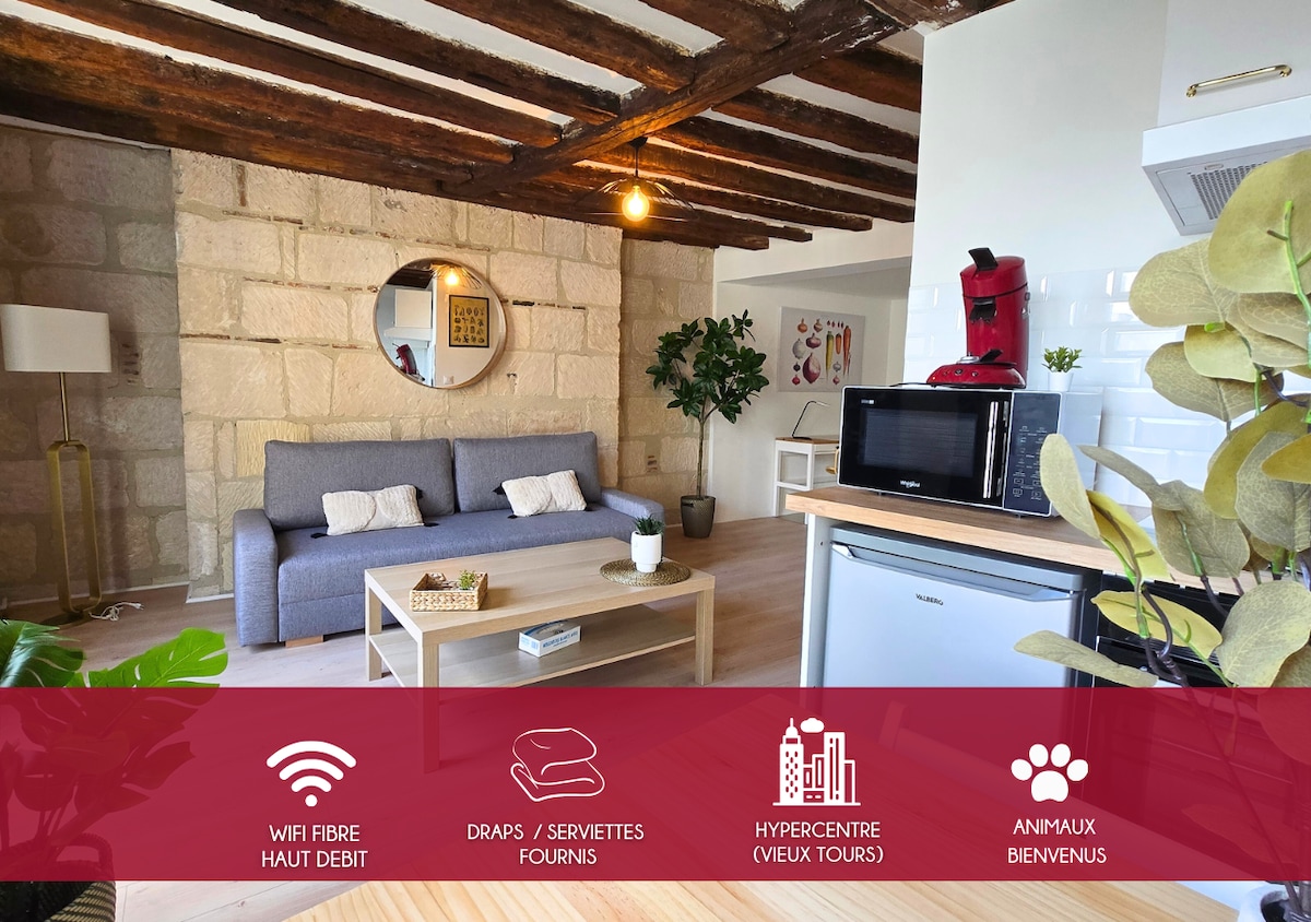 Très bel appartement de 60m² avec pierres de tuffeau apparentes typiques du vieux Tours. Dans l’hyper-centre, face aux Halles à 1 minute à pied du quartier historique. Pour 6 personnes. Une grande pièce de 45 m² et une chambre ouverte sur une salle de douche. Les animaux sont les bienvenus dans ce logement sous réserve de prévenir de leur présence. Les fêtes/soirées bruyantes sont strictement interdites pas de bruit après 22h Non accessible aux personnes à mobilité réduite pas d’ascenseur.