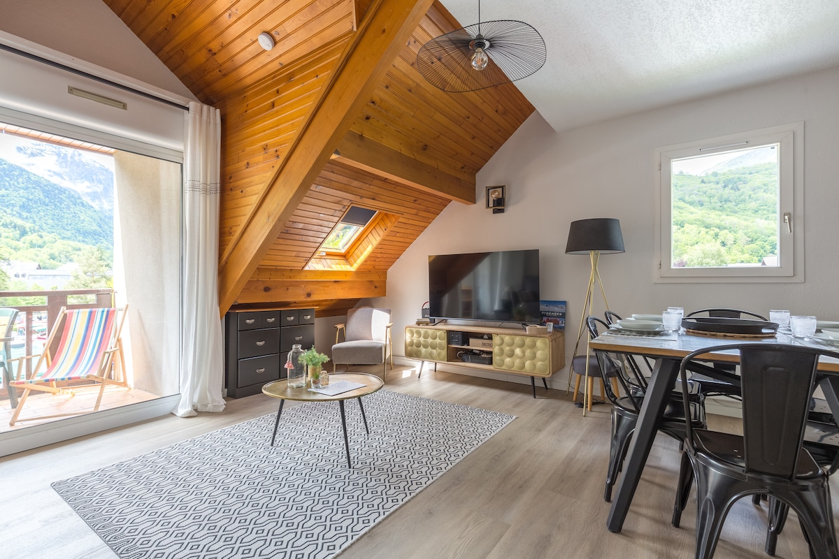Bel appartement calme et lumineux T3 duplex de 50 m² idéalement situé au centre-ville et à 3 min à pied des télécabines. Rénové entièrement par le propriétaire, 1er étage, grande terrasse vue sur la montagne Au RDC: Séjour/Cuisine équipée Salle de bain double vasque, douche + lave linge. WC séparé Terrasse 15 m² Casier à ski et parking privé extérieur. A l'étage: Chambre 1 (5 pers.) : 1 lit en 140 + 1 lits superposés 3x90 Chambre 2 (4 pers.) : 1 lit en 140 + mezz. avec 2 lits en 80 (ou 1*160)