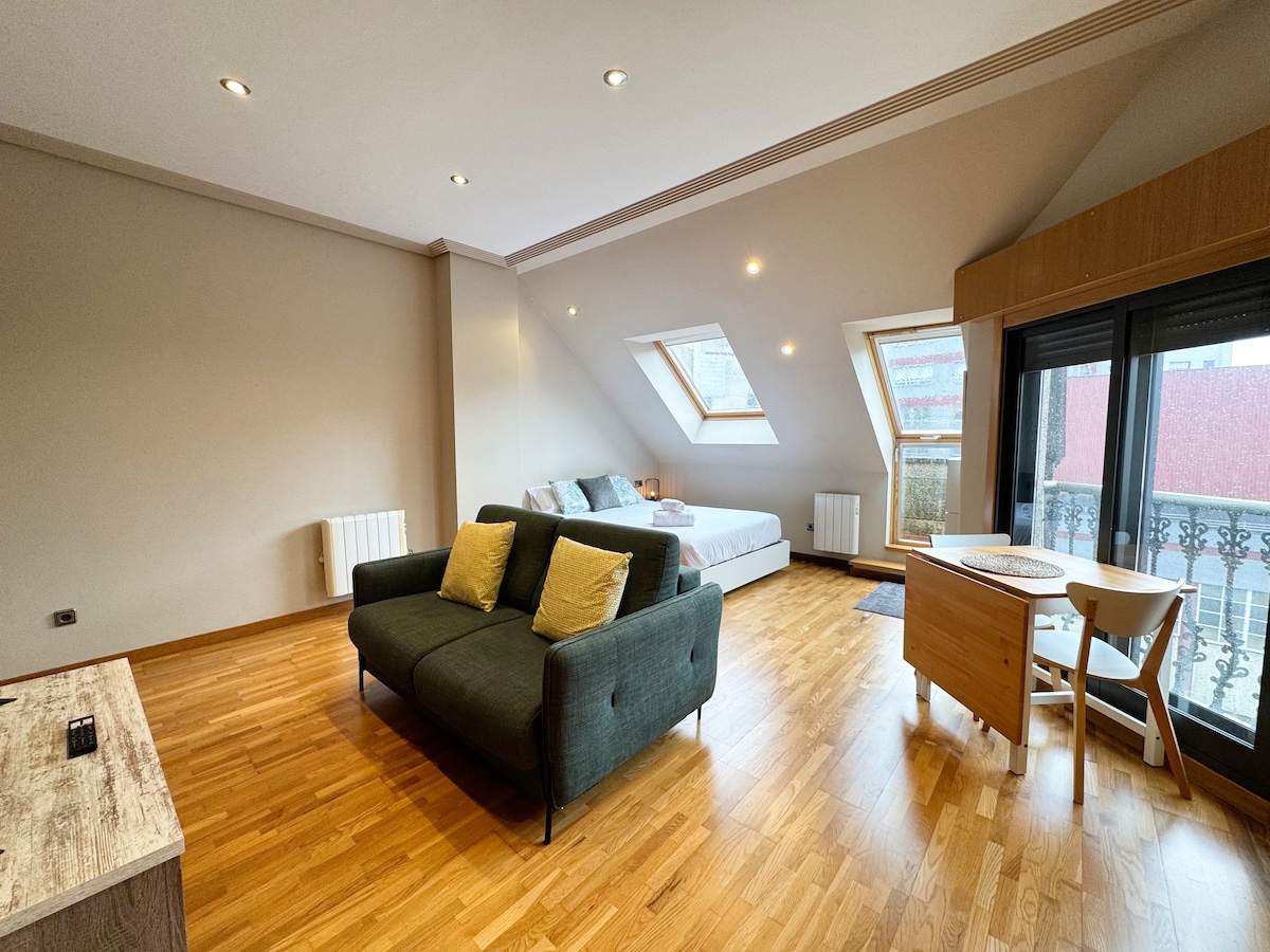Una experiencia de lujo en este céntrico y luminoso apartamento equipado como una suite de hotel. Edificio histórico. El dormitorio, presidido por una confortable cama King size, Smart TV, balcón y un baño completo. El salón cuenta con una coqueta cocina americana, un comedor, Smart TV de gran formato, una cómoda mesa de trabajo junto al ventanal y un sofá- cama. Dos ventanales de tres metros de altura con balcones que se asoman a la “Puerta del Sol de Vigo”. Próximo al puerto- Islas-Cíes