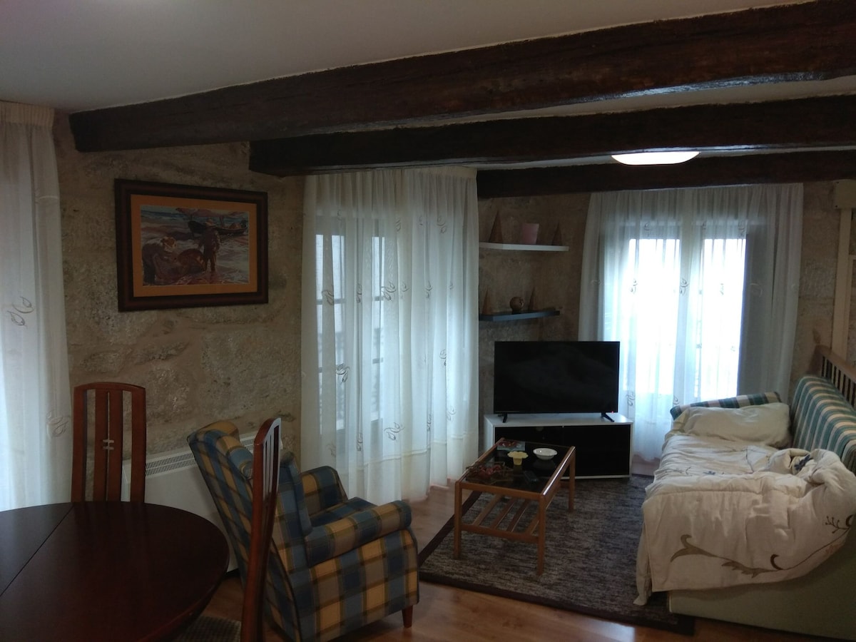 Loft rústico a pie de calle con entrada independiente, en el corazón del barrio antiguo de Bouzas a 50 metros de la playa con agradables zonas de paseo (Ej: Museo del Mar 15min andando). Distribución: - Espacio abierto con cocina, comedor, salón con sofá y tv, y cama doble (160x200cm). - Habitación con cama doble 135cm. - Amplio baño con ducha. Supermercados, farmacias, bancos, panaderías, bares y taperías alrededor. Ruidoso a veces. ⛔ Prohibido Fumar. Paradas de bus y taxi a 50 metros.