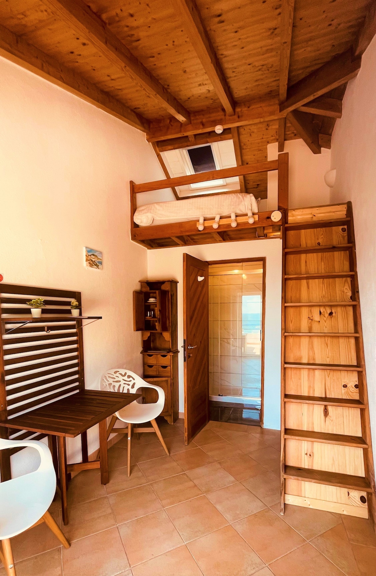 Quarto para 1 ou 2 pessoas situado no segundo piso da pensão. Ambiente Atelier, cama de casal no sótão, casa de banho, frigorífico, chaleira etc. Terraço com visto para o mar.