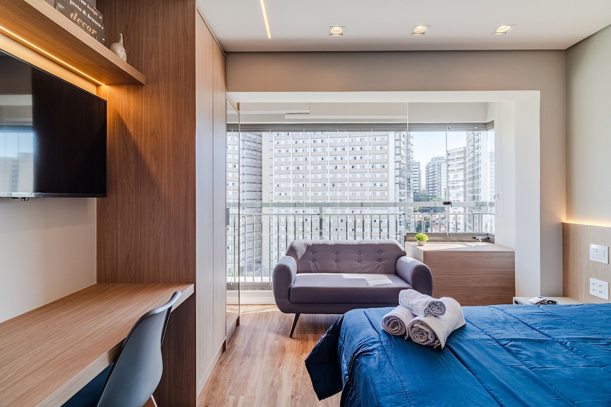 Welcome and make yourselves at home. The apartment is brand new, designed especially for you and has impeccable decor, very practical for everyday life. The view is spectacular! The apartment is on the 28th floor. We are in an excellent location in São Paulo, in the Pinheiros neighborhood, with restaurants, supermarkets and bakeries very close by. It's 40m2 (430 sqft) with 1 bedroom and 1 bathroom. Walking distance from Fradique Coutinho subway station (just 2 blocks).