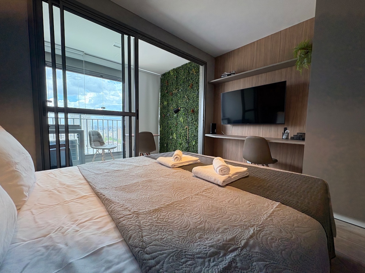 Confy design Spa apartment. You'll have your onw private sauna and ofurô with an incredible view of the São Paulo DownTown Dedicated exclusively for guests. Área privativa de 82m2 e se localiza em um edifício de construção nova, da construtora Cyrela, com acabamento em alto padrão, com segurança e portaria 24h. Há apenas 50 metros de distância há um supermercado que funciona 24h por dia, de domingo à domingo. O metrô fica na esquina, há apenas 100 metros do edifício.