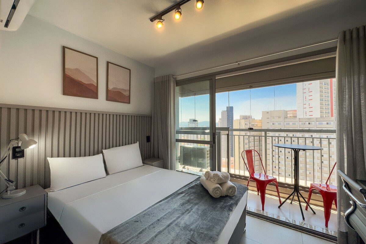 A 300 do metrô V. Madalena, perto de restaurantes, lojas, bares e espaços culturais. Cama de casal super confortável, A/C, internet, SmarTV 42", bancada grande para trabalho, mesa para refeições, decoração estilosa, janelas retráteis com muita luz natural e vista da cidade. Cozinha compacta conta com mini refrigerador, cooktop elétrico de duas bocas, filtro de água, sanduicheira e liquidificador e utensílios de louça. Piscina climatizada, academia, lavanderia e mini-loja de conveniência.