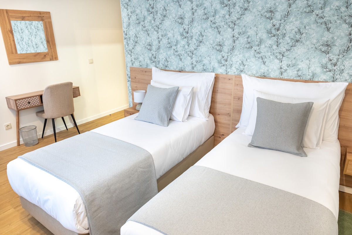 Este quarto twin oferece o conforto de duas camas de solteiro e uma casa de banho privativa, garantindo privacidade e comodidade durante a sua estadia na Casa Dona Edite. Além disso, desfrute de uma vista deslumbrante para o Vale do Douro, proporcionando um ambiente tranquilo e inspirador para os nossos hóspedes. A piscina é para todos da Guesthouse.