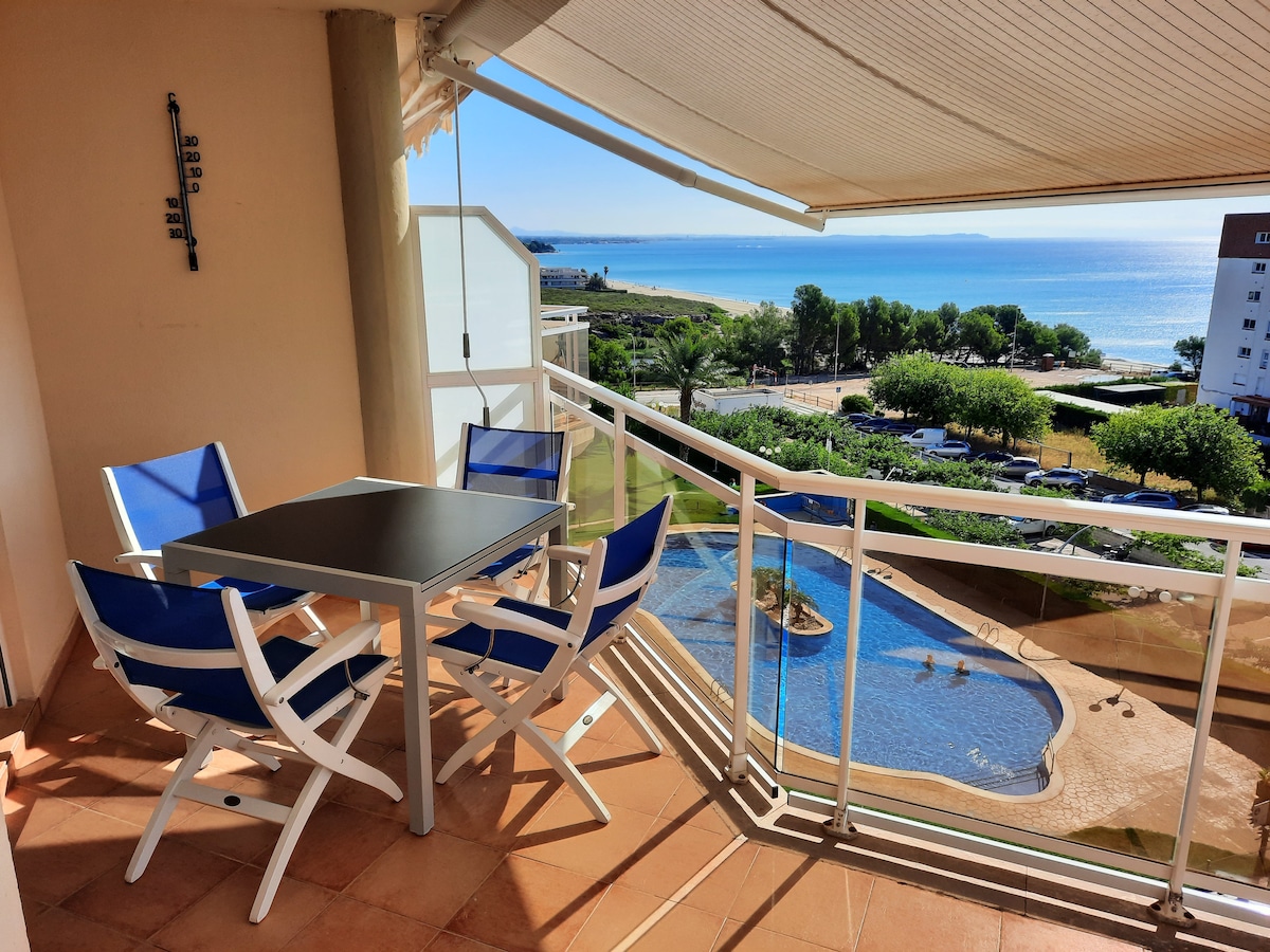 Apartamento con espectaculares vistas, situado en Miami Platja provincia de Tarragona, dispone de 2 dormitorios, uno con una cama de matrimonio y el otro dormitorio con dos camas individuales, equipado con todos los juegos de cama y baño, 1 baño completo, salón comedor con televisor, cocina equipada, terraza frente al mar, piscina comunitaria, ascensor y parking privado exterior.