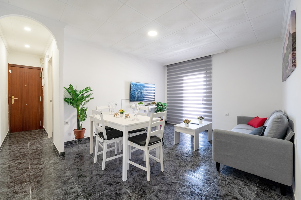 Apartamento luminoso y acogedor, muy bien equipado (Wifi, AC, amplio balcón, etc..) Dispone de 2 piscinas comunitarias en la azotea del edificio con vistas espectaculares al mar y 360° de todo Salou. A 2 minutos andando de la playa. Muy bien hubicado, a pie del edificio encontraréis: - Supermercado - Parada de autobus - Parque municipal - Restaurantes, tiendas, ocio... - Av/ Carles buigas (peatonal)