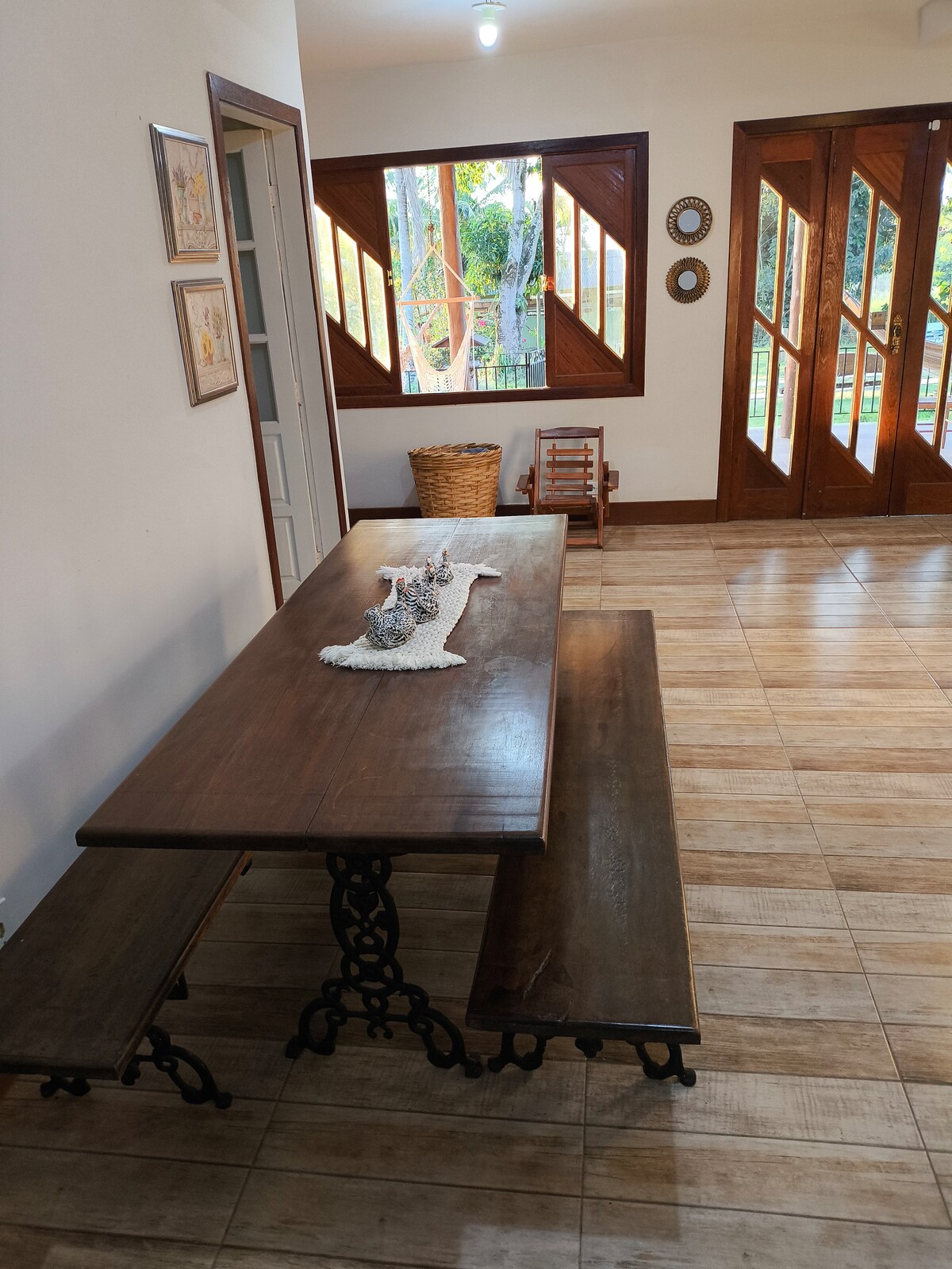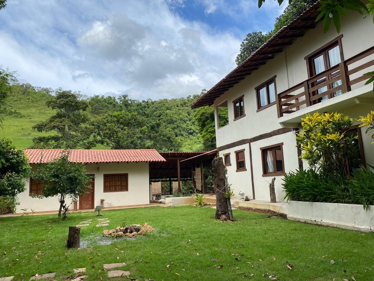 Sitio inteiro em área rural de Guarapari, um lugar para esquecer os problemas, relaxar e conviver com a natureza exuberante, com 2 casas rústica. Composta por 1 suíte e 4 quartos e 2 salas com sofá cama casal, mais um alojamento para 20 pessoas, no total o nosso Sítio comporta até 36 pessoas, todos os quartos e salas possuem ventiladores de teto. Cozinha externa completa, área de churrasco com fogão industrial, fogão a lenha, geladeira e freezer e WI-FI Um refúgio com piscina e praça de lual.