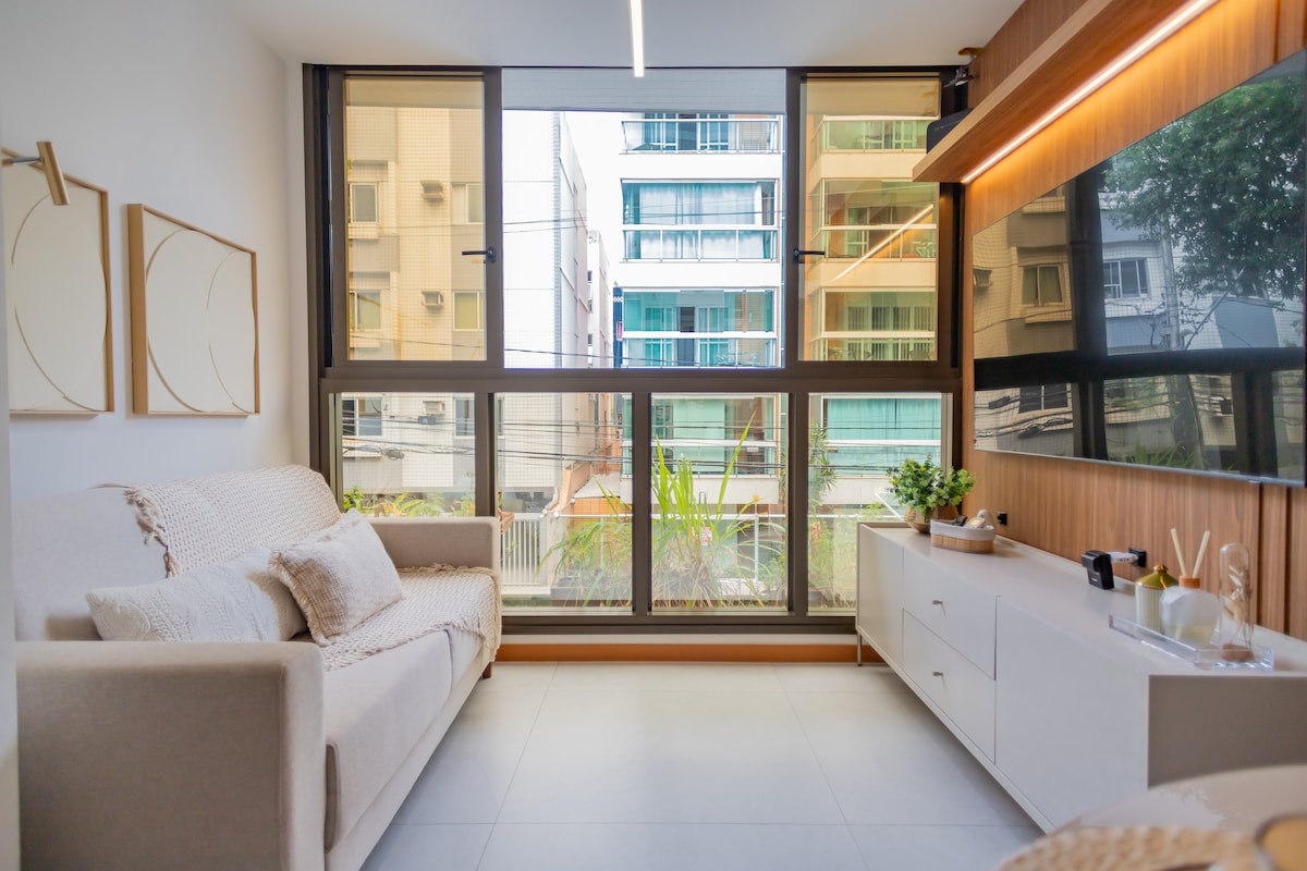 Flat reformado em 09/2025, com móveis e enxoval novos. Vista incrível para o mar, andar alto, varanda e ambiente climatizado. Localizado na região mais nobre da cidade, com piscina e fácil acesso a pé aos melhores bares, restaurantes, lojas, mercados e academias. Conforto e praticidade em um só lugar!! Checkin e Checkout Flexíveis (mediante a disponibilidade)