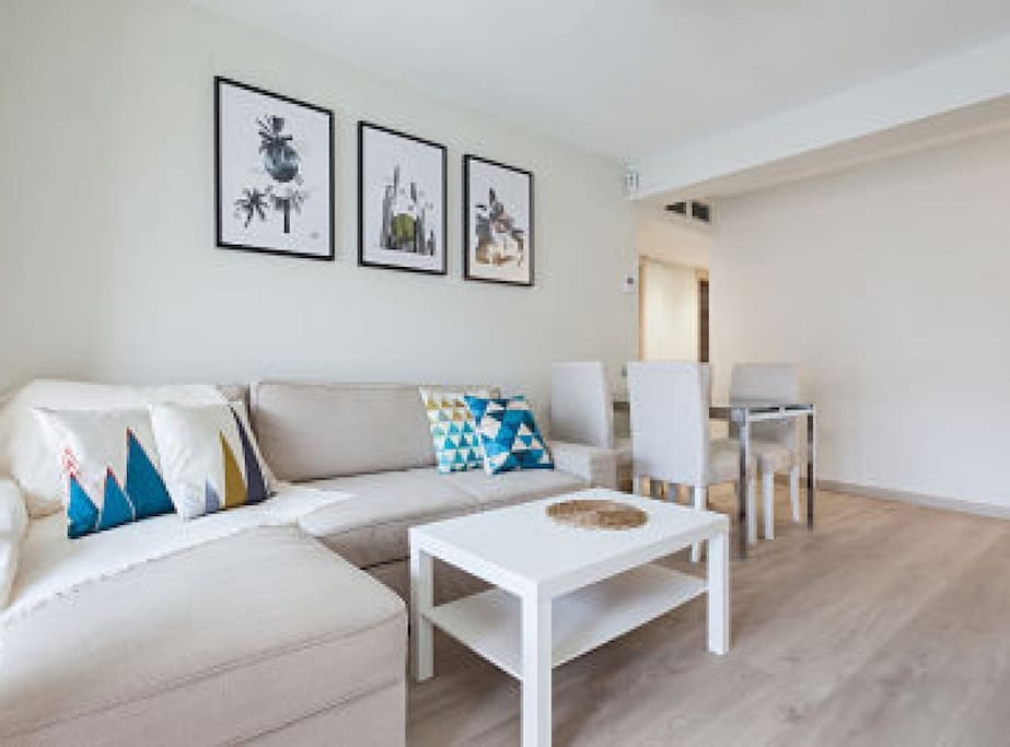Fully equipped, newly renovated Nordic-style property with: a double room, dining room, living room with comfortable sofa bed, full bathroom and fully equipped kitchen. Large floor-to-ceiling window with natural light all day SMART40’TV, NESPRESSO coffee machine, kettle, complimentary capsules & tea, HIGH-SPEED INTERNET optic fibre, A/C, washer & dryer machines, dishwasher. 1,8x2m KING-SIZE BED, top-quality mattress, SOFA BED for the 3rd-4th person. Available extra floor mattress for 4th person