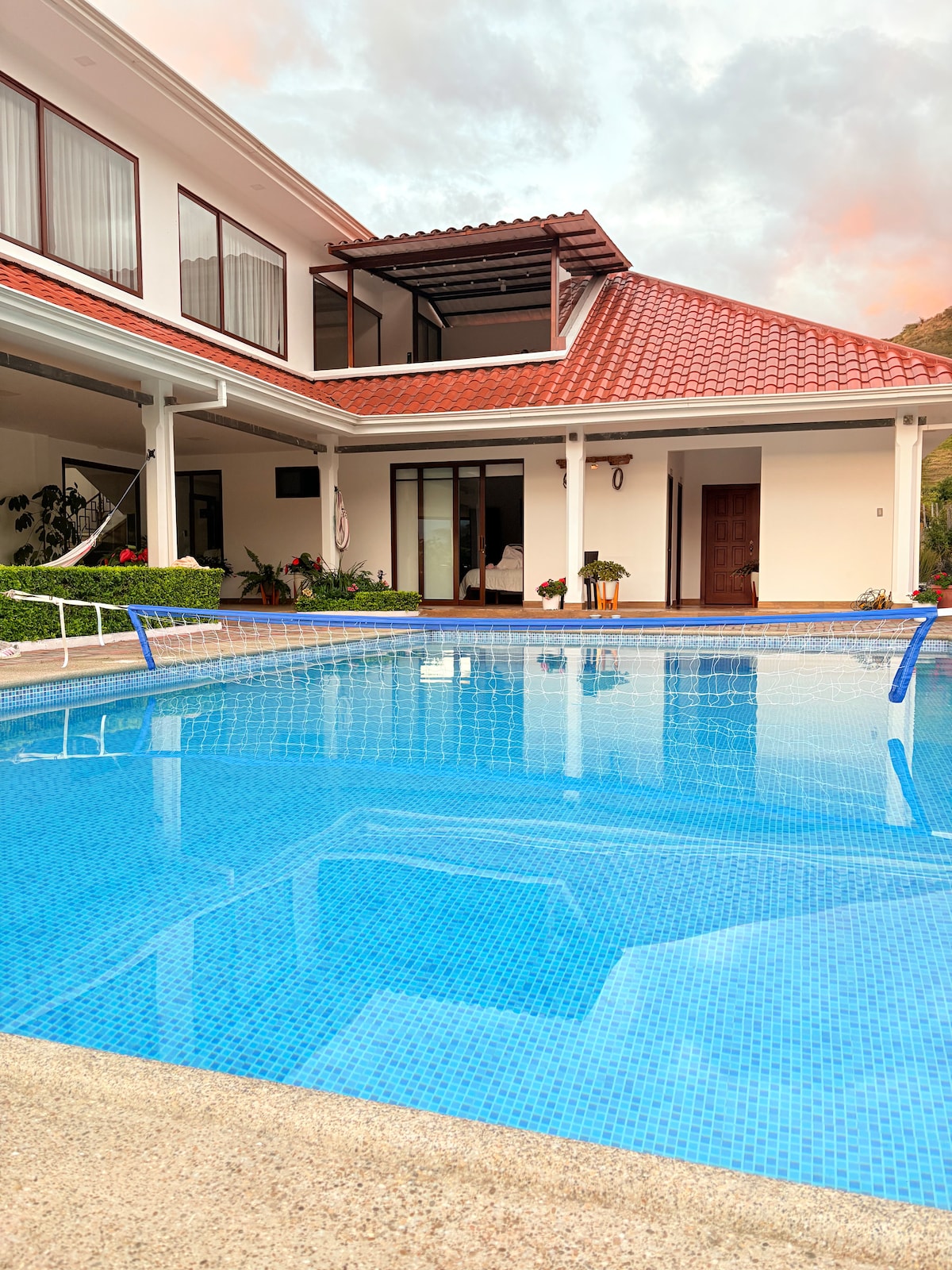 Relax and breathe in the fresh air with the whole family at this beautiful home and property. A short walk to the river with nearby hiking trails to explore the surrounding mountains. Enjoy the privacy and safety of this gated community nearby the idyllic town of Vilcabamba. Enjoy the pool, sauna or hot tub while the kids jump on the trampoline or play basketball. The outdoor covered terrace is a lovely place to enjoy a meal, or watch the colorful birds move through the gardens.