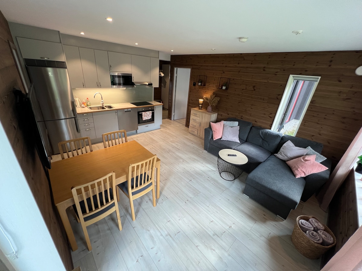 Lägenhet i två plan i ett lantligt läge sex minuter från skidbacke, cykelpark, Vildriket, cykelarena och eljlusspår för löpning och längdåkning. På sommaren har du mountainbikecykling utanför dörren. Byggår 2020, allrum med kök och matplats för sex personer plus barnstol, två sovrum, allrum med soffa och fåtöljer, badrum med dusch, tv-rum med dubbel bäddsoffa, wifi, laddning för elbil.