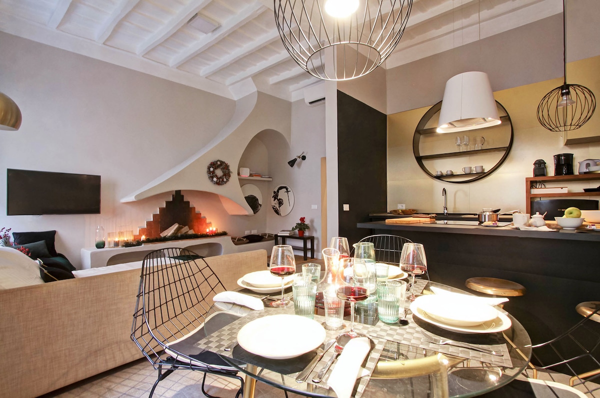Light the large stone fire and relax with a book in this elegant home overlooking Via dei Banchi Nuovi. Coffered ceilings cap cozy rooms in relaxing, neutral tones accented by designer furnishings and owner's original paintings. This charming fully renovated house is located in one of the most beautiful, ancient and vibrant area of the center of the Eternal City. We also like to offer eco-sustainable hospitality: we use electricity from renewable sources, organic products.